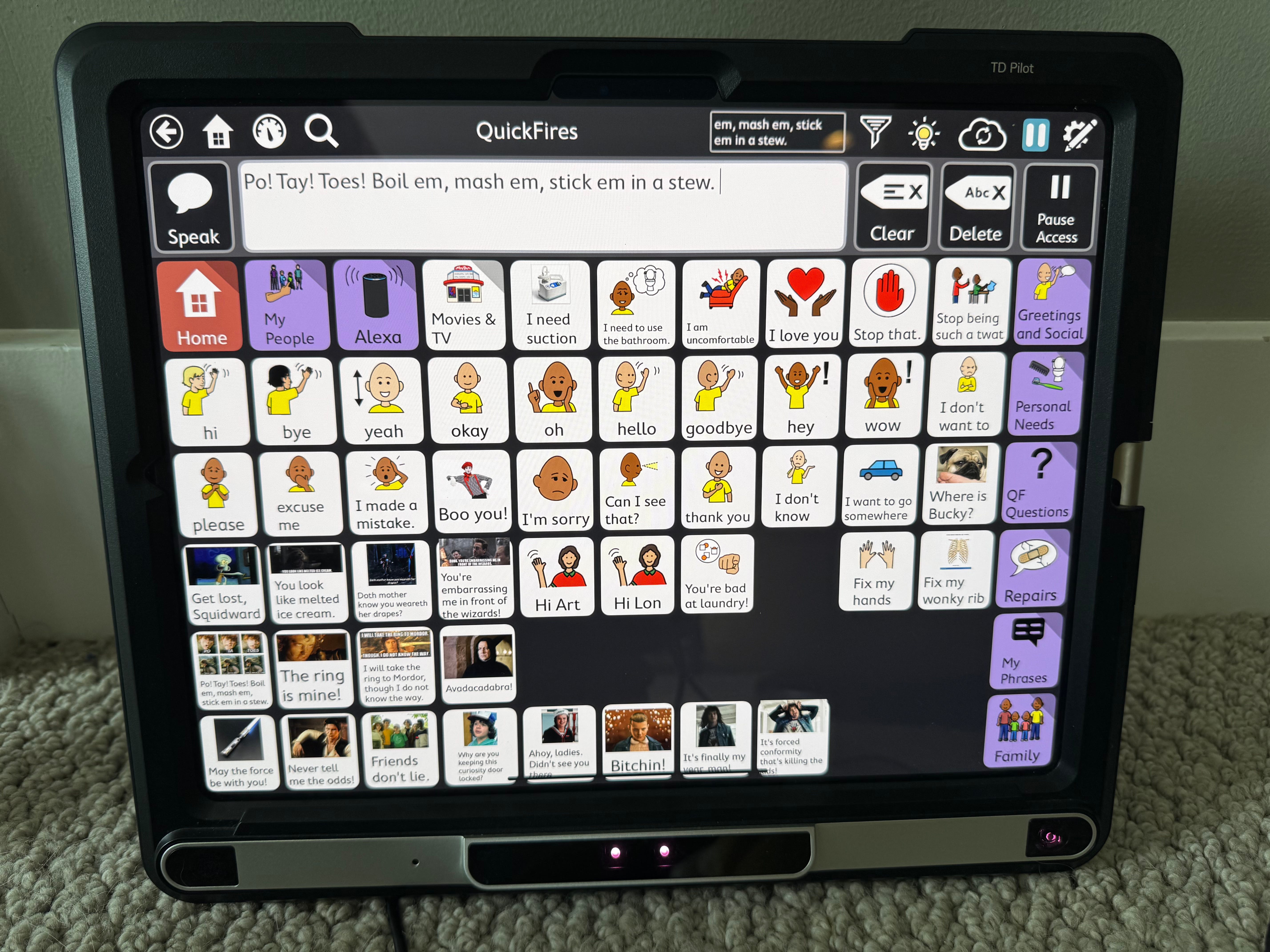 Still, we programmed it with some of his favorite movie lines: You’re embarrassing me in front of the wizards. I will take the ring to Mordor, though I do not know the way. It’s forced conformity that’s killing the kids!