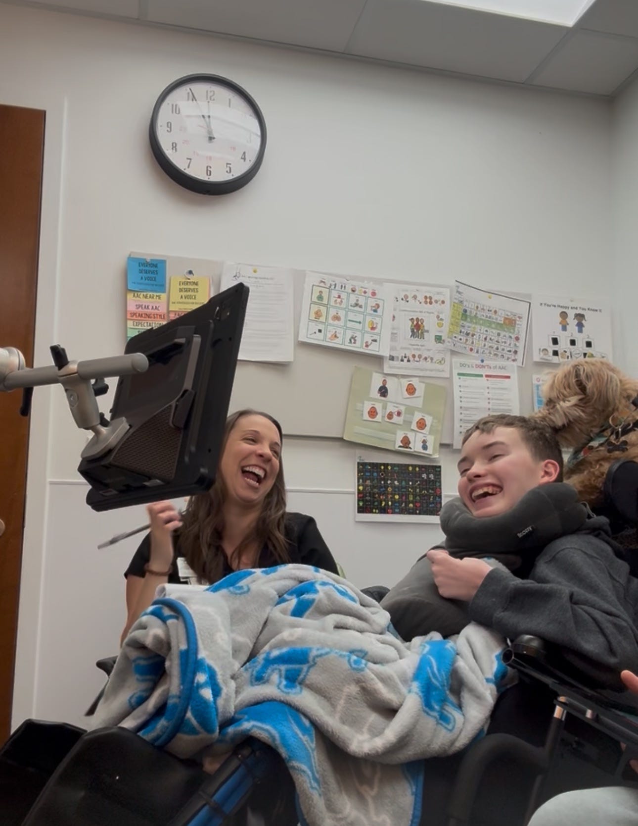This week, when I felt an un-nesting window crack open, I decided to remove some villains. I started with his Tobii Dynavox, a fancy eye-gaze speech device. This is essentially a mounted tablet that allowed him to type and speak using only his eyes. In theory, it was supposed to be his voice. In practice, he found it exhausting.